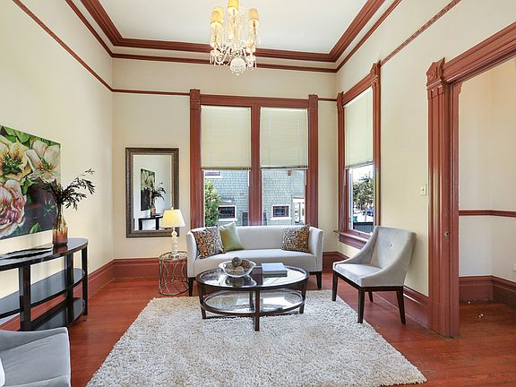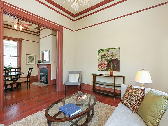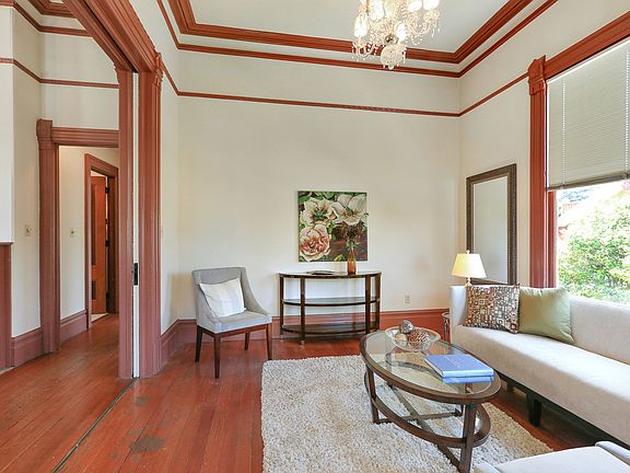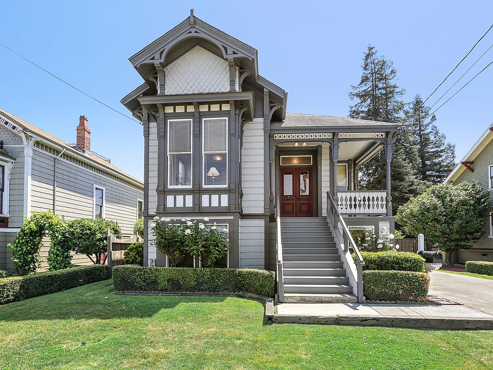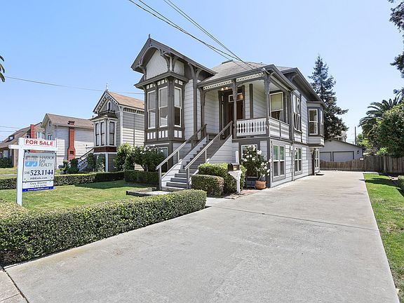 Overview: 2648 square feet, 3+ bedrooms, 2 baths, extra large 2-car garage Built in 1885, this meticulous Victorian home showcases detailed craftsmanship of the Eastlake Stick era—the architectural transition from the Gothic Revival to Queen Anne. Representing the decorative style typical of Eastlake, the façade is a treat for the eyes—light gray vertical siding marries ornamental dark gray trim and a rich red wood and glass front door. Against the manicured green front lawn and bursting white roses, the exterior visage is picture perfect. Main Level – Gracing the living spaces inside, the remarkable design continues with towering 12-foot ceilings, intricate crown molding, ornate chandeliers, and original wood floors. The open and airy living, family, and dining room—all connected with doublewide pocket doors—feature a gas fireplace for toasty ambience and natural light pouring in from all sides through tall, squared bay windows. The main level also includes an original full bath with a special claw-foot tub, a large sunny guest bedroom, and the fully updated kitchen with breakfast sitting area. The kitchen opens to a broad back deck, perfect for outdoor dining on a warm, lazy evening. Lower Level – Quietly situated downstairs is a sitting area, full private office, second bedroom, large nursery, and the spacious master bedroom. The bedrooms features large closets and are both served by the second period bath. Two storage areas/closets complete the lower-level layout. Accessible from the back deck and the long driveway on the side of the house is the pristine backyard. Wispy birch trees and the flower-filled gardens create a peaceful setting. Relocated from 1520 Grand St. in 1976, a new space was found for the house at 418 Santa Clara where a new foundation, new electrical and plumbing was added. On a unique neighborhood street and with the cafes, boutiques, and shops on Webster just a short stroll away, the location is superb. This is a rare opportunity to own such a pristine and historic home.