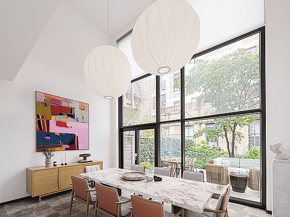 Upon entry, you are greeted with a charming foyer/sitting area which opens to an immaculate chef’s kitchen and dining room with dramatic height - featuring floor to ceiling glass, facing the back yard. You'll find mahogany floors, central air, oversized windows, and radiant heat throughout. The entire second floor is encompassed by the living room, which is overlooked by a beautiful mezzanine complemented by a gas burning fireplace in the main sitting area.