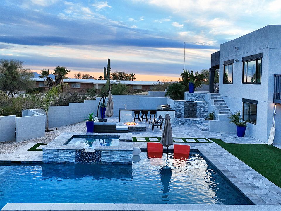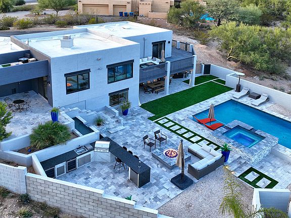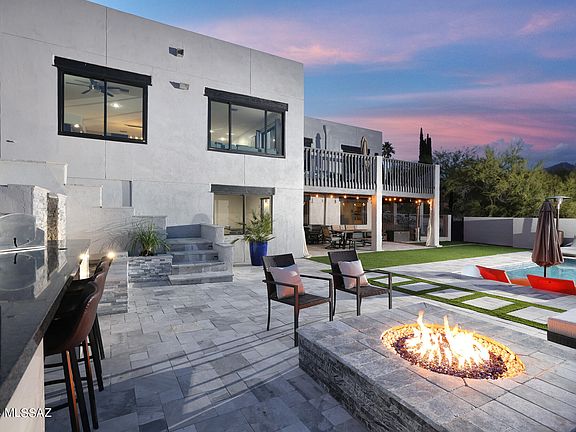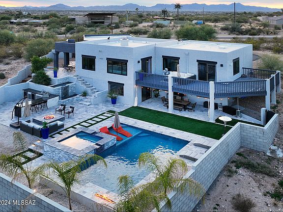Luxury living is waiting for you in this serene resort-like desert oasis! This home sits on a private hilltop lot in the popular Catalina Foothills of Tucson. You get it all with the breathtaking, 365 degree views that allow you to enjoy the picture-perfect mountains, twinkling city lights, and the famous Tucson sunsets off your rooftop balcony with spiral staircase. Take your outdoor living to the next level in the outdoor kitchen with wine fridge and keg, heated pool with lagoon, waterfall jacuzzi, cozy gas fire pit, 2,000 sf of travertine, 2 covered patios, and palm trees that add the perfect finishing touches. Don't forget the interior features such as the walk-out basement with built-in bar for more entertaining, wood plank tile floors, windows that allow you to enjoy (continued) the backyard even from inside, open kitchen, and perfect master suite with balcony for your morning coffee. If a high-end short term rental opportunity fits your investment desires, this home brought in $105,000 of income in 2023 and already has $74,000 of pre-booked reservations for the coming months that can be transferred to the new owner for the perfect AirBNB option. Call today to schedule a showing and get a private glimpse of this one of a kind home you don't want to miss out on!