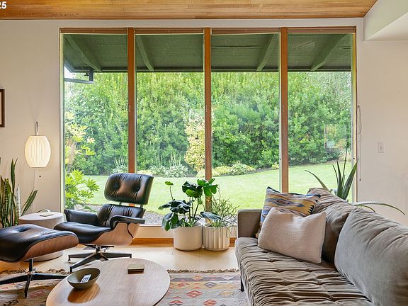Rare, custom Northwest Regional Style mid-century modern home, built by its original owner Elwyn Kinney of Barnard & Kinney Construction, renowned for their detailed craftsmanship with projects at Salishan and the Japanese Gardens. This unique residence has high quality, well preserved original woodwork throughout, including vintage built-in bookcases & dressers, and beautiful wood-paneled walls that exude warmth and character. Stunning vaulted wood-clad ceilings throughout the main floor living room and kitchen with clerestory windows washing the living space with natural light showcasing the beautiful warmth of the natural wood. The living room also features cork flooring, floor-to-ceiling windows that bring the outdoors in overlooking the lush and meticulously landscaped backyard. The wood-wrapped fireplace is a work of art with a floating concrete bench and vintage tile hearth. The light and airy kitchen is open to the casual eating space with intelligent built-ins throughout. The primary suite offers cork flooring, vaulted wood ceilings, and large windows with serene nature views. The main level includes three total bedrooms, with an additional bedroom and full bath on the lower level. The lower level also features a spacious great room with high ceilings, polished concrete floors, and flexible storage/work spaces. Enjoy year-round outdoor living on the large covered patio within the fully fenced backyard, surrounded by established landscaping featuring a perfect blend of mature Japanese maple trees and grapevines. Aggregate stairs lead to the inviting entrance, complemented by an attached double car garage and a large driveway for off street parking. Located on a dead end street, a half block to Kennedy Park and around the corner from Kennedy community gardens, this home offers easy access to nature and community. Benefit from Washington County taxes and Beaverton schools, all while being minutes away from downtown Beaverton, Nike, Portland, and Jesuit.