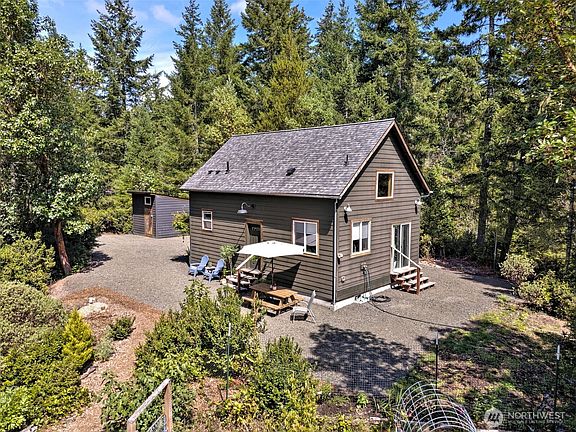 This very cool cabin located on almost 3 acres sits on top of a hill just across the road from Mason Lake & offers great privacy but has wonderful access to all "the things"! This compact home features a great primary bedroom on the main level, a loft for additional sleeping or office/den & a big open living, kitchen & dining area that has high vaulted ceilings & tons of light. The finishing touches are really nicely done as the photos show. All of the appliances are included so just pack your bags and move on in! You will love the property! From the great garden area to the little spots and trails throughout that make great hideaways to read or just sit & enjoy the natural beauty. Might be able to open up a lake view with tree trimming!