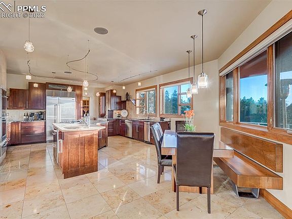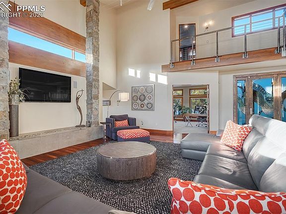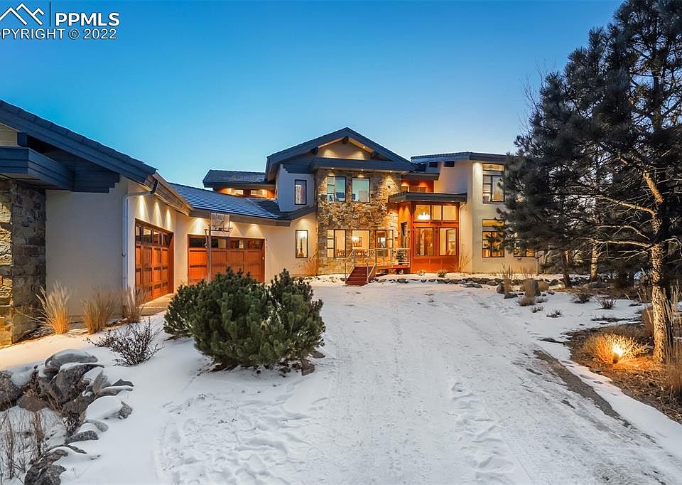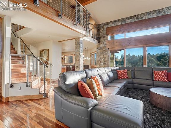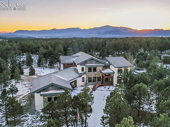 This exquisite and timeless mountain contemporary estate in the prestigious gated community of High Forest Ranch awaits new owners. Showcasing 5 bedrooms, 7 baths and oversized 4-car garage, this stunning home blends style and design with the sought-after combination of wooded privacy and Pikes Peak/Front Range Mountain views on nearly a 3-acre lot. The large open interior spaces to entertain with all bedrooms complete with private en-suite, spa-like baths make this home unique and viable for multi-generational living. Luxury appliances grace the gourmet kitchen and your outdoor living spaces will have you enjoying this home and property year-round. Features of this amazing home includes a Lutron system, radiant heat, home theater, custom wine room off dining area, primary suite with waterfall wall and soaking tub, covered deck off kitchen area with access to the outdoor kitchen, lower level with wet bar, rec room, theatre room, a FLEX space room/suite is accessed from the lower level and is perfect for a workout facility/additional suite/office with full bath attached. A must-see-to-believe property for sure with attention to detail everywhere you turn. Do not miss this opportunity to own a one-of-a-kind estate in one of the most desirable locations in the Pikes Peak region.