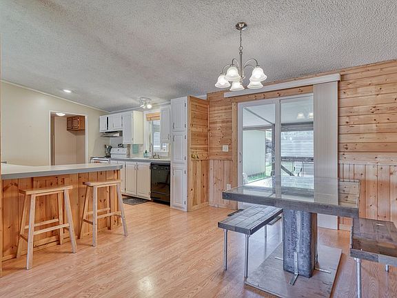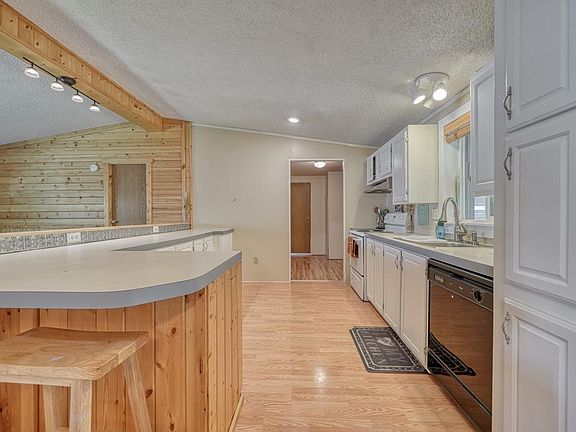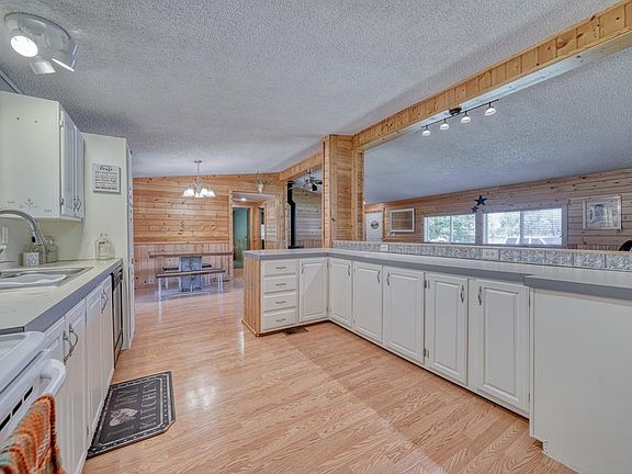 PRIVATE .88 LOT WITH WONDERFUL HOME! From the serene landscape to the beautiful interior, this home is a retreat! The spacious living room with its vaulted ceilings, cozy fireplace, beautiful tongue and groove walls seamlessly flows into the kitchen creating the perfect space for entertaining! The kitchen boasts a breakfast bar, white cabinets, abundant storage and prep space and a wonderful eating area with outdoor access (great for hosting summer gatherings). Allowing for separation and privacy, the master suite is on the opposite side of the home from the 2 additional bedrooms. The master bedroom suite has fantastic natural light with views of the surrounding landscape, a sizable soaking tub, tile floors, double sinks, separate shower and a nice walk-in closet. The main floor also houses a full bathroom with a brand new floor and vanity and a spacious laundry room with new flooring and access to the backyard. There is room to roam and enjoy the grounds of this property which features mature trees, a barbecue area with a privacy wall (gas and electric hook-ups), a fully fenced backyard, a dog run, an RV pad, more RV parking and an over sized 2-car garage with custom built shelving. The back patio can be enjoyed with the Plexiglas windows open or closed!
