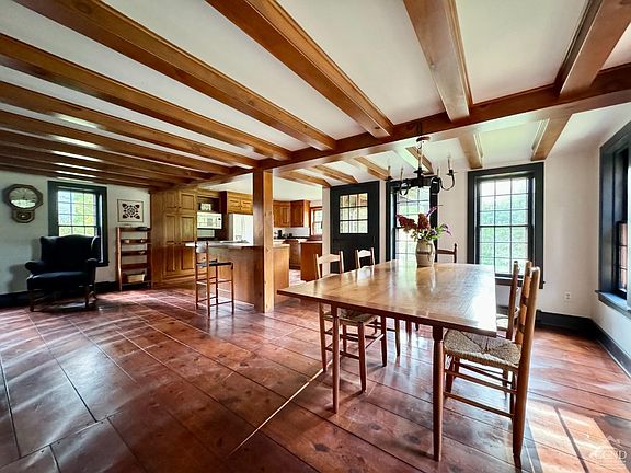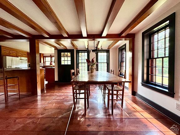 In an Upstate hamlet listed on the National Register of Historic Places, the Vollmuth-Langlois House brings to the Columbia County market an expansive residence with impeccable upkeep and historicpreservation, featuring 3 bedrooms, 4 bathrooms, 5 wood burning fireplaces and a wood paneled office space. The home is situated on an acre and a half lot sloping gently downwards to the banks of the famed Valatie Kill and includes a two-car attached garage. Boasting vertical grain, western cedar clapboard siding with rosette flooring nails and a cedar shake and copper roof, this residencehas been painstakingly restored and expanded to stay true to its original 1820 Federal farmhouse standards of building design and excellence.This 3200 square foot home features a beautiful eastern facing dine-in kitchen with handcrafted cabinetry and wrap around windows, for a garden view from every vantage point. Many interior rooms retain the beauty of exposed beams, dentil cornices, cast iron key-latch original doors and 9over 9 and 9 over 6 sash windows. The entire home is graced with period perfect wide plank hardwood or hand-laid red brick floors and the formal entrance staircase handrail is a work of art. North Chatham NY is a close-knit community nestled in a collection of charming 19th century residences of architectural significance surrounded entirely by equestrian estates and pastoral farmland. Once a trolley stop on the Albany-Hudson line developed in 1795 and conveniently situated between the villages of Kinderhook and Chatham NY and 2.5 hours from NYC, this offering embodies the essential Upstate farm to table lifestyle with fabulous restaurants, shops and cultural attractions nearby.