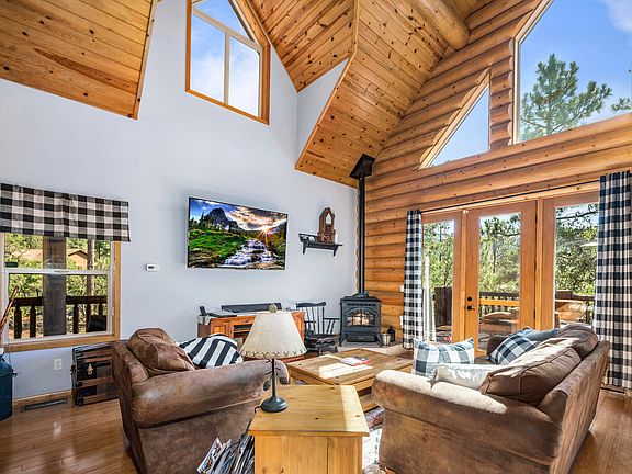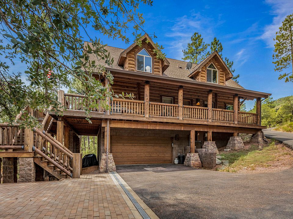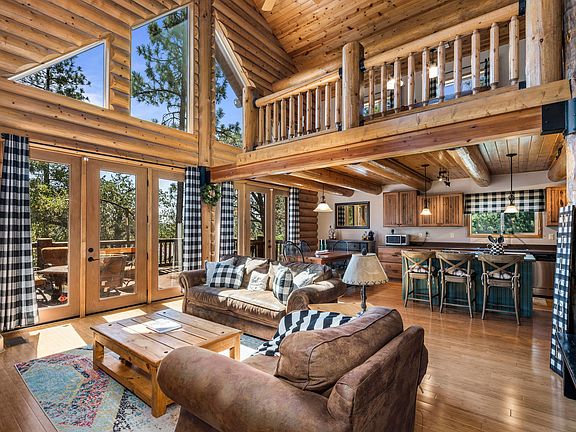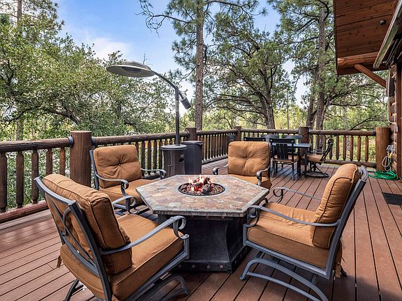 Welcome to the community of Strawberry Hollow in Pine AZ! Featuring 4 bedrooms, 3 bathrooms & loft. Great open floorpan to entertain and rooms and bathrooms are split for privacy. Sitting on a third acre lot with mature ponderosa trees and amazing views. Enjoy the mountain air and wildlife from your large open deck with motorized awning. This log cabin home welcomes you in with high vaulted ceilings, bamboo flooring, Eat-in kitchen with Stainless steel appliances and beautiful Hickory Cabinets. Large private master bedroom offers a peaceful retreat. The lower level includes a large 2 car garage, finished basement complete with a bedroom, full bathroom and a bonus room. This home is perfect for full time or part time living. Located just down the street from Pinewood Tavern.