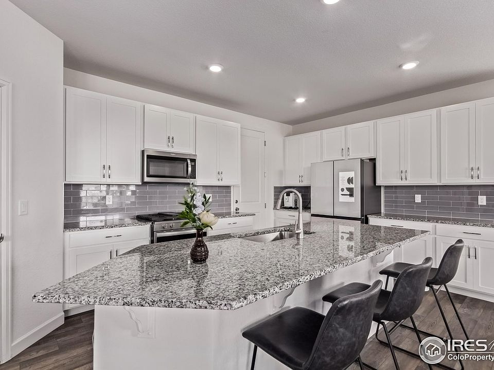 Spacious primary suiteMassive islandGranite countersStainless smart appliancesCovered patioOpen space and trailsWide-plank flooring