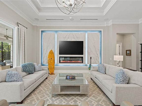 Step into luxury with this beautifully updated home offered turnkey and recently enhanced with newer premium features throughout. Enjoy immersive sound throughout via the brand-new audio system and test your culinary skills in the gorgeous gourmet kitchen featuring stainless steel appliances, two islands, two ovens and a spectacular butler’s pantry complete with wine refrigerator, beverage drawers and ample storage. The recently renovated great room is anchored by a stunning white Carrara porcelain feature wall—elegantly backlit—to create a striking focal point. Beautifully appointed throughout, the furniture is both sophisticated yet inviting. Relax in the primary bedroom with all-new flooring, custom closets and spa-like bath. The oversized lanai, with plenty of entertaining, relaxation space and all new furniture offers something for everyone including privacy with tranquil sunny views of the natural surroundings. Showcasing the new outdoor fireplace is a sleek porcelain accent wall and the fully equipped outdoor kitchen offering ease of entertainment with a brand new grill and an oversized island topped with exquisite white Thasos quartz. Feel secure and keep out the elements with retractable hurricane shutters while additional features and upgrades offer a state-of-the-art Navion water system, full house generator, tankless recirculating water heater, 3 car garage and much more.