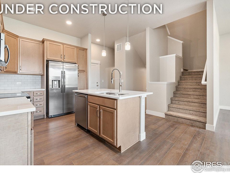 Landmark Homes presents The Shores at the Lakes at Centerra, where quality, convenience, nature & beauty meet! The Camden plan offers a fenced front porch, full unfinished basement w/ rough in plumbing for bathroom for room to grow, full laundry upstairs w/ bedrooms, expansive primary bedroom, primary bath w/ dual vanity & walk-in closet & a design process you'll fall in love with! Come see the exceptional luxury interior features: high efficiency furnace, tankless water heater, & gorgeous, designer selected "Luxmark" standard finishes, quartz counters, tile surrounds, under cabinet lighting, fireplace, stainless appliances, tile floors in laundry & bathrooms & 2 car garage included. Enjoy quality craftsmanship & attainability, in a community conveniently located to shopping, banking, dining, medical facilities & nature trails. Pool, clubhouse & surface lake access included w/ Master HOA & Metro District. Schedule your private tour today! Model located at 3425 TRIANO CREEK DRIVE #101, LOVELAND, CO.