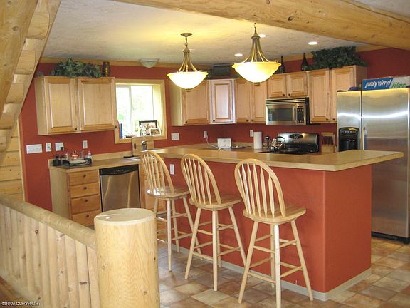 Moving on up! Charming,like new log home on 4.31 gorgeous acres of privacy,rolling hills & Birch trees near the Golf Course.Huge wrap around deck,spacious bedrooms,gas fireplace, hot tub,high vaulted ceilings, wired for surround sound, faux rock siding, 840 SF log shop & lovely yard. Master suite at the top level with walk-in-closet & a private bath with double sink vanity. What a find!