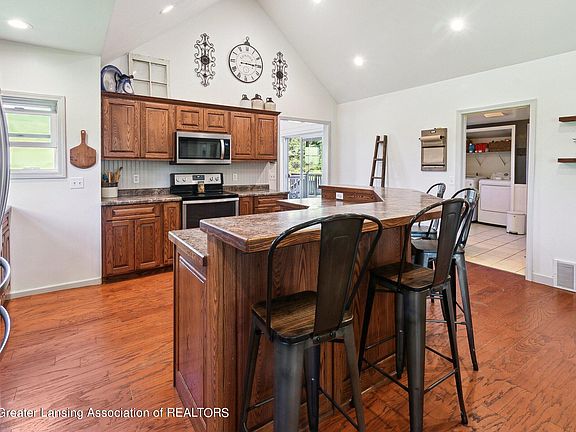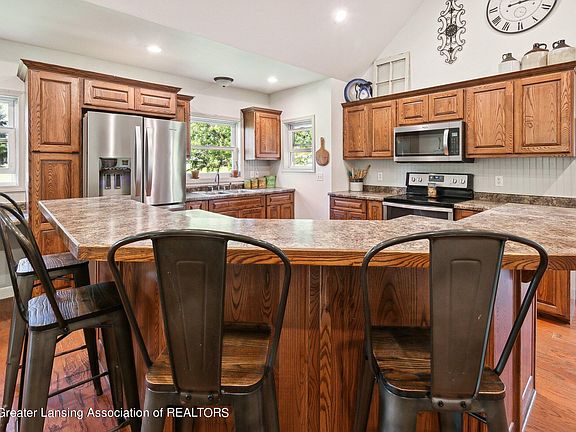 Welcome to 4184 N Bagley Road! Step into this breathtaking farmhouse, meticulously remodeled to perfection! Discover a spacious kitchen adorned with custom cabinets and elegant vaulted ceilings. Enjoy the luxury of all-new essentials: furnace, central air, water heater, and water softener. The pole barn shines with its fresh metal roof, while an expansive 800 sqft deck beckons for entertainment. The property boasts LG washer and dryer, complemented by stainless steel Whirlpool appliances. Spread across nearly 2 acres, this gem sits in a prime location, centered to Saint Louis, Ithaca, Alma, and Breckenridge. Don't miss out—schedule your showing today and envision yourself living in this beautiful farmhouse!