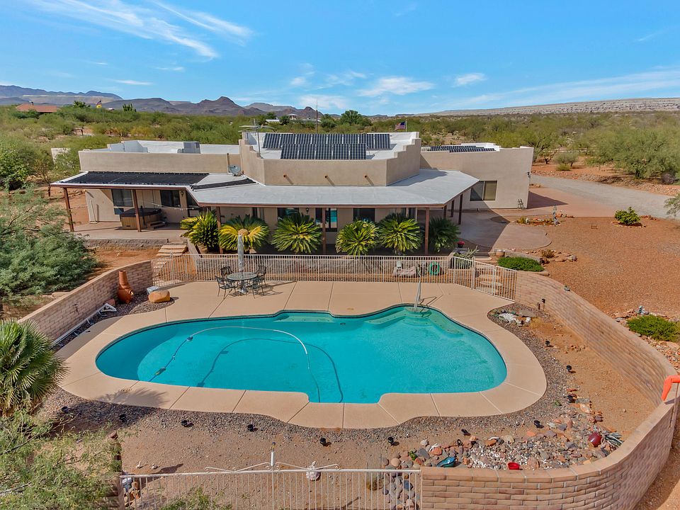 Once you arrive on this property you will appreciate the privacy that the fenced 4.15 acres has to offer. The gated circular drive takes you to the front security gate and large enclosed front entry. Upon entry into the foyer you will appreciate the substantial entry hall. The guest bedroom and jack and jill bath are at the front of the home. The master suite with saltillo tile throughout is sizeable with access to the patio and hot tub, significant walk-in closet, jetted garden tub and walk-in shower and a dual vanity. The third bedroom or den is conveniently located just off the large great room. The great room has windows and sliders all around to enjoy the views of the desert flora and the Santa Rita Mts. The kitchen, with a center island and breakfast bar, has ample storage with pul outs in most of the cupboards. The laundry room, with plenty of additional storage, is handily placed off the kitchen and garage entrance.
