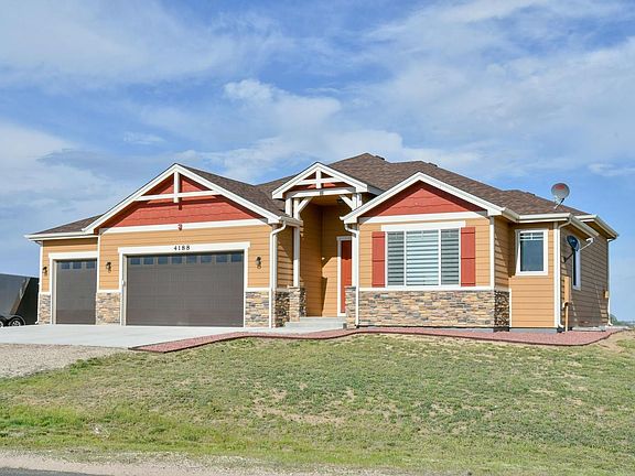 This beautiful newer ranch is located on 3 acres in Buffalo Ridge. Built in 2016, this home has many upgrades and is in almost-new condition. With 5 bedrooms, 3 full baths, a finished basement, and lots of space to roam, this is a perfect home for a growing family! Many upgrades include kitchen granite counters; large kitchen island; soft-close cabinets; upgraded stainless appliances including double electric oven (convection). Beautiful hand-scraped hardwood floors on the entire main level (including bedrooms); coffered ceilings in master bedroom, foyer and dining; 11 ft ceiling and a tiled wall feature in great room. All bedrooms have walk-in closets! The basement is fully finished including a family room with wet bar/kitchenette with icemaker, dishwasher, and mini fridge; work out rec room; two large bedrooms & a full bath. Finished and insulated 3-car garage. The covered rear patio is perfect for summer BBQ's. Mountain views. Horses OK. Outbuildings and camper parking OK.