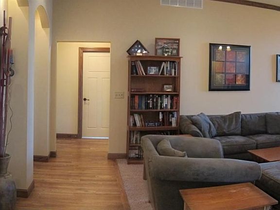 The quality is obvious in this home. Beautiful large woodwork and gorgeous hardwood flooring. Etched decorative windows, gas fireplace, wrought iron railing and multiple lit art niches. Custom Wood cabinetry thoughout plus kitchen tile backsplash, eat at bar plus lg area for dining table, stainless steel appliances and great under cabinet lighting. Master bath has large Jacuzzi tub, huge privacy window, tons of custom built-ins for storage, walkin closet and double sinks. MB, LR, and FR have speakers built in for music thoughout. Good sized laundry with cabinetry & deep soaking sink.
