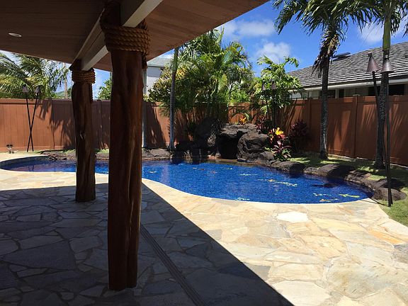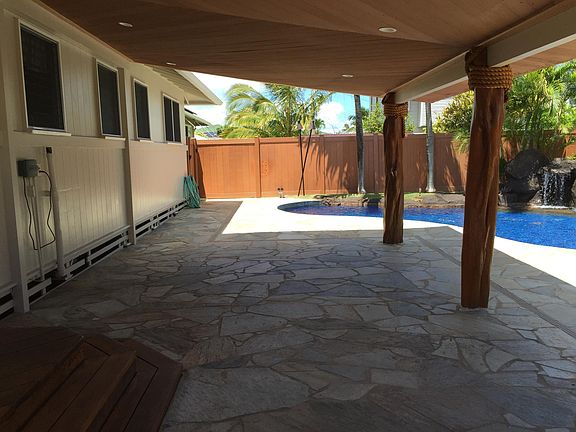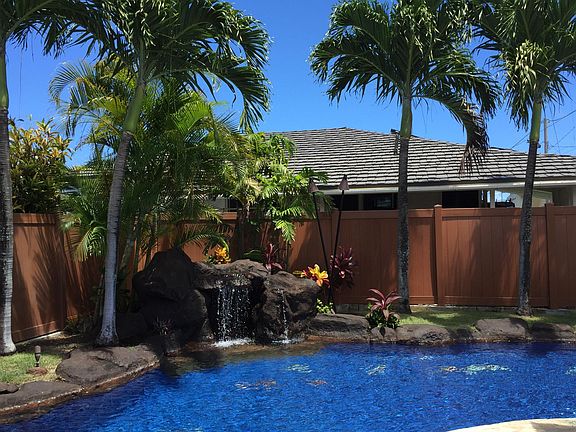 Beautiful 3 bed/2 bath home in the heart of Kailua with a beautiful tropical oasis in your backyard! Gorgeous swimming pool with a rock waterfall, beautiful landscaping, Jacuzzi hot tub and covered patio with breezy tradewinds. Perfect for indoor/outdoor living in Kailua! The homes original hardwood oak floors just refinished. Modern and updated bathrooms with new porcelain tile and granite vanity tops, ceramic tiled floors in the kitchen with stainless steel appliances. Ceiling fans in every room, A/C units in 2 bedrooms. 2 car carport, *W/D hookups, solar water heater and a large storage shed. Walking distance to Kailua town, shopping, restaurants, & schools. Kailua beach just a few blocks away. Close to Kaneohe Marine Corps Base, just about a 5 min. drive. Home is located at the end of a lane and the backyard with the pool is completely fenced in and private. Pool and yard service included. Please email to schedule a time to view the home. Pets negotiable. Available April 1st. $4700/mo. No smoking/vaping
