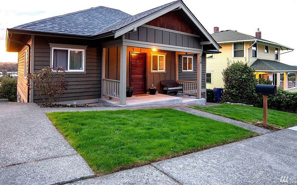 Perched proudly atop Historic Renton Hill offering commanding views of Lake WA, Seattle skyline & downtown Renton. This quaint craftsman is well laid out & includes galley kitchen w/ SS appliances, granite counter tops, laminate flooring & updated cabinetry. Full tiled bath w/ granite top vanity. Carpeted living area opens to sunny deck. New patio in back! Lower level with lots of potential to make your own.