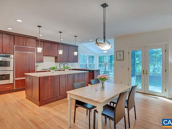 NEW PRICE! Enjoy quality craftsmanship and the privacy of the country in Earlysville. Custom-designed, then custom-built by Alexander Nicholson, this two-story home with finished basement offers sun filled rooms, custom design details plus two outdoor terraces. The open concept floor plan is anchored by an expansive kitchen (Sub-Zero fridge, Viking gas range, Thermador double ovens and Bosch D/W) on one end and a Living Room featuring a stone fireplace on the other. Custom cabinetry throughout. The main floor design provides the ideal balance to the 2nd floor and basement areas - which offer individual spaces for sleep, working from home, and recreation. A first floor Home Office can be used as a cozy Den or as a 5th Bedroom. You’ll love the setting: serene privacy on five mostly wooded acres with a level green space for play, adding a pool, gardening or entertaining. Three-car garage and work space provides ample storage space for work and play. Located 8 miles from shopping, dining, and CHO airport. CenturyLink hi-speed internet. Floorplans available. Come see what all the fuss is about! Shown by appointment.