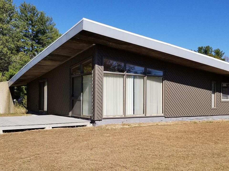 Location, location, location, unique Hyperbolic Paraboloid shaped, 2 bedroom, 2 bath, ranch with 1 car spacious detached garage. Bright, sunny. open concept floorplan, fully applianced kitchen, hardwood and tile flooring, oil heat, central A/C, large airy bathroom with access through the master bedroom and outer hallway. Fantastic, open lower level family room complete with pool table, bar area for entertaining.., and even a murphy bed for overnight guests. Lower level laundry room with washer and dryer, 3 season porch off the dining room and sliders to a deck off the living room. Beautiful country setting yet convenient to Manchester, the seacoast, and commuter routes! Tenant pays utiities