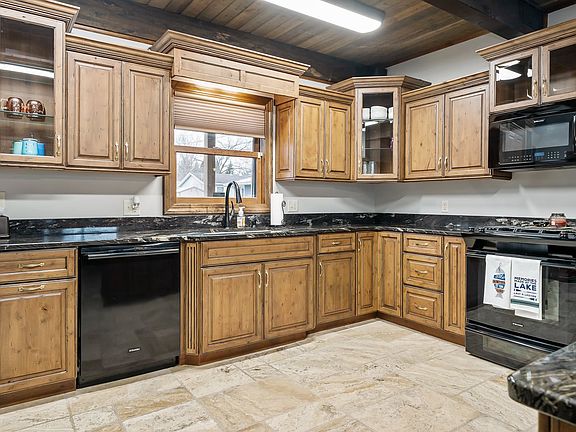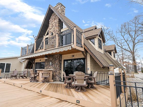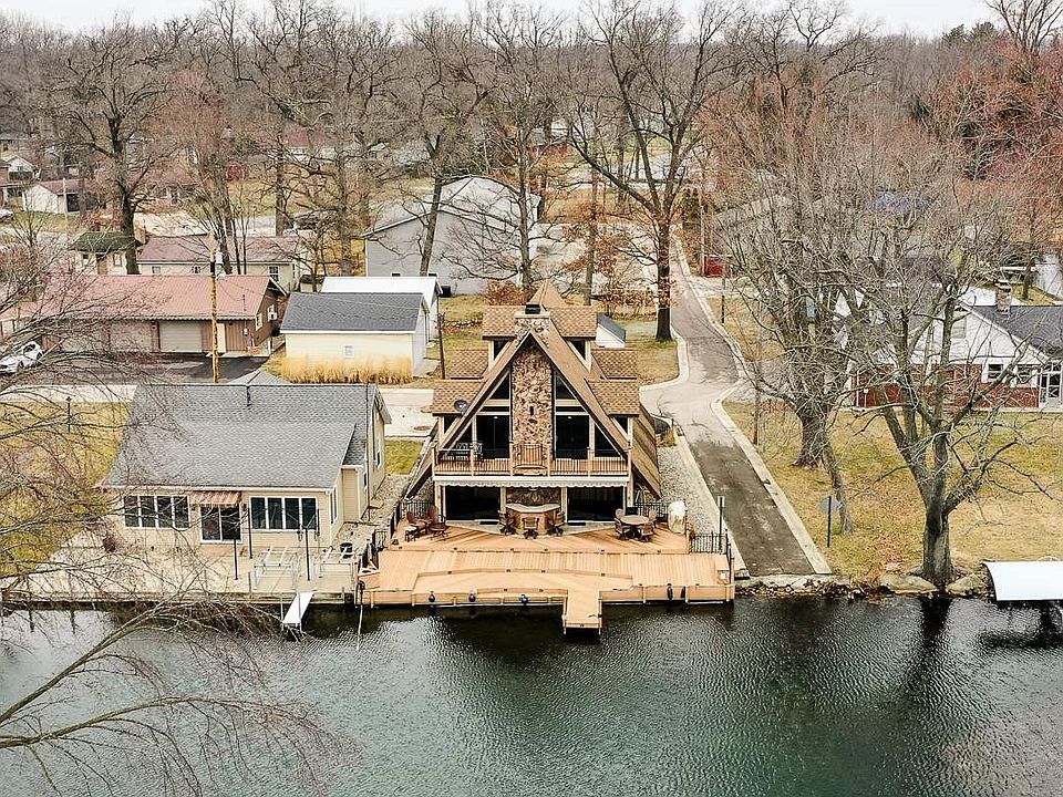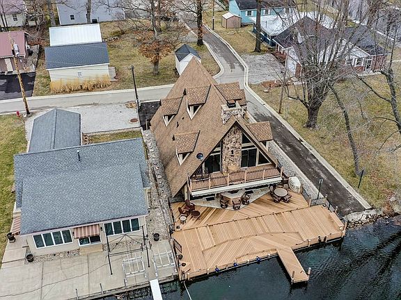 Absolutely beautiful home on wide Lake Wawasee channel so close to the open water that you have unobstructed views of the lake! Gorgeous tiled floors and granite counter tops adorn the large kitchen and bathrooms. The kitchen also features beautiful custom cabinetry along with an eat-in area along with plenty of room for a dining room table. Great room has a floor to ceiling fireplace in case of chilly evenings. Two sets of glass doors lead from the great room out to the expansive composite deck on the water. Main floor bath features a tiled garden/jet tub with rain shower; twin sink vanity gives everyone room. The second level features two more glass doors leading to the second floor balcony/deck overlooking the water, and a family room area which could also be used for more sleeping area for your lake guests. French doors lead to the master bedroom which has its own tiled bath with a stand up shower. Follow the spiral staircase up to the third level which is used as a bedroom. Now, here is something not normally found at the lake...a huge 3 car garage with a carport and asphalt parking area. There is also room for parking at the house on the asphalt. Vinyl shake shingle siding and the GAF lifetime Grand Sequoia shake shingles complete the look for this uniquely beautiful home. Owners say they love to wave to the SS Lillypad sailing from The Frog as it goes by!