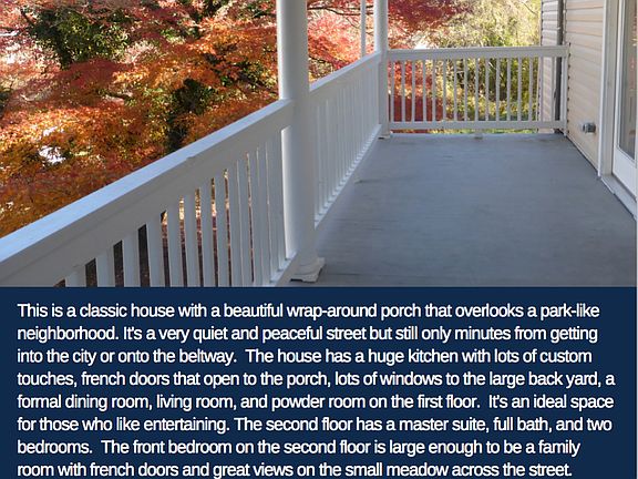 This classic house with a beautiful wrap-around porch that overlooks a park-like neighborhood is just waiting for its new family. It's a very quiet and peaceful street but still only minutes from getting into the city or onto the beltway. The house has a huge kitchen with lots of custom touches, french doors that open to the porch, lots of windows to the large back yard, a formal dining room living room, and powder room on the first floor. It's an ideal space for those who like entertaining. The second floor has a master suite, full bath, and two bedrooms. The front bedroom on the second floor is large enough to be a family room with french doors and great views on the small meadow across the street. Upstairs on the third floor is another bedroom and game area. The basement has a finished family room with backyard access, a huge storage area, and a utility room. New zoned HVAC/Central air, Kitchen, Bathrooms, Stainless Steel Appliances, windows, doors, and flooring.