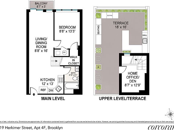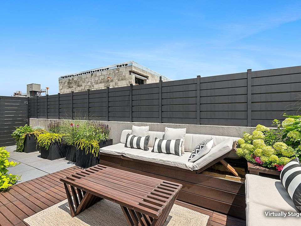 419 Herkimer is a beautiful and bright one bedroom + home office duplex apartment with 2 private outdoor spaces in the heart of booming Bed-Stuy. On the first level of this like-new condo is an open concept living/dining area, a bedroom with large windows featuring custom blinds and a fully loaded kitchen with Bosch and Blomberg appliances. This level features a small balcony off the living room. A flight of stairs leads to the second level, suitable for a home office that leads to a massive and beautifully landscaped rooftop terrace with panoramic views. The rooftop includes a bar, wine cooler, grill, TV and custom furnishings. Washer/dryer available in building. Within close proximity to subway lines and amenities just one block away on Fulton st, this apartment is a must see. Within close proximity to all shops, eateries and cafes along Tompkins, Fulton, Stuyvesant and Lewis. The C train at the Kingston-Throop Ave Station is just right around the corner on Fulton Street.