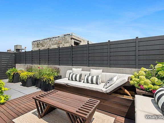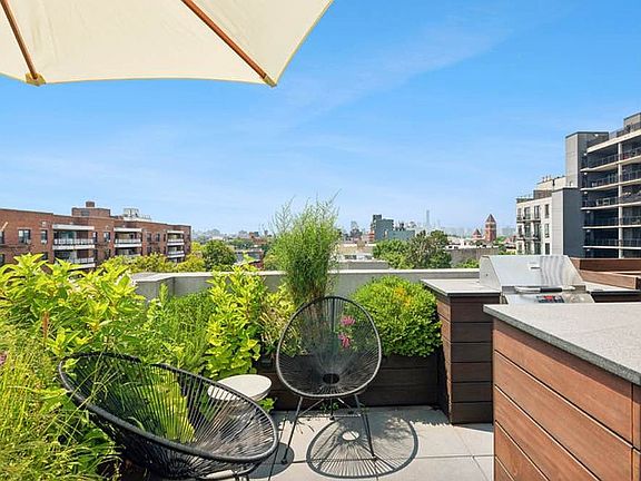 419 Herkimer is a beautiful and bright one bedroom + office/den duplex apartment with 2 private outdoor spaces in the heart of booming Bed-Stuy. On the first level of this like-new condo is an open concept living/dining area, a bedroom with large windows featuring custom blinds and a fully loaded kitchen with Bosch and Blomberg appliances. This level features a small balcony off the living room. A flight of stairs leads to the second level, suitable for a home office that leads to a massive and beautifully landscaped rooftop terrace with panoramic views. The rooftop includes a bar, wine cooler, grill, TV and custom furnishings. Washer/dryer available in building. Within close proximity to subway lines and amenities just one block away on Fulton st, this apartment is a must see. Pet friendly building. Within close proximity to all shops, eateries and cafes along Tompkins, Fulton, Stuyvesant and Lewis. The C train at the Kingston-Throop Ave Station is just right around the corner on Fulton Street. Tax Abatement through 2031. This condo building is sublet friendly, perfect for 1031 exchange and investor.