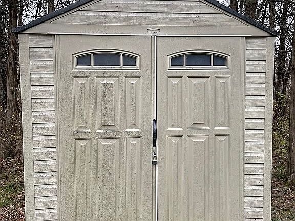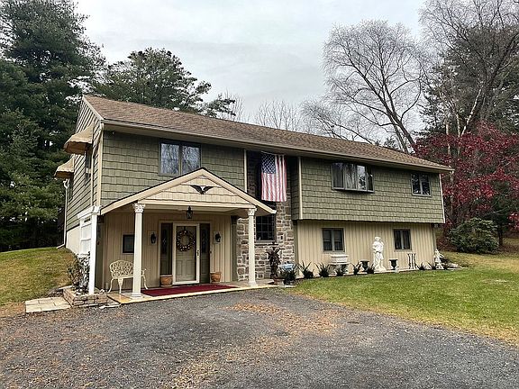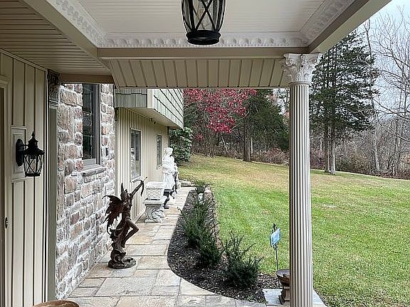 Vinyl sided home with attached portico. Garage is detached from home. Finished basement. On demand hot water, no tank. House centrally located on 5 acres. Very private setting.
