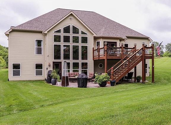 ATRIUM RANCH on almost half acre lot backing to trees with 6 acres of common ground in the front. Oversize deep & wide heated garage with 8 ft. doors. Over 5,000 sq. ft. of luxury living with Canadian Birch Hardwoods, Inverted Vaulted Great Room with Gas FP, Chef's Kitchen with Monogram SS Appliances, including built-in refrigerator, wall oven, gas downdraft cooktop, custom cherry cabinets with ginger glaze and crown molding. First floor has two half baths. Master suite has whirlpool & a custom tile shower, separate sinks and a huge luxury walk-in closet with built-ins. Atrium LL is finished with a Theatre Room including TV and Surround Sound Speakers, a den, an exercise room, a rec room & a large wet bar with granite counters & 2 drawer refrigerators, a large storage/hobby room. Outside is complete with a stamped concrete patio & drive, a cedar deck overlooking trees and beautifully landscaped yard with sprinkler system. Intercom, Security, Dual HVAC, Theatre Equip, 400 Amp Service.