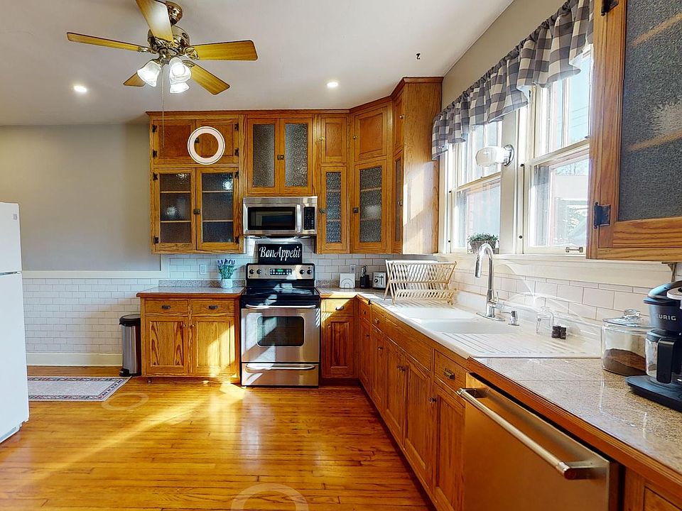 Short-term fully furnished rental. Spacious and cozy with hardwood floors throughout. Beautifully restored to its original 1920's glory. Set up to meet your needs. Clean, uncluttered spaces, full kitchen, Wi-Fi, and the basics for an easy stay. Third bedroom offers office space in addition to bunk beds. Relax on the front porch in this lovely neighborhood. Just a few blocks from main street's offering of coffee shops, restaurants & entertainment. MCT bus stop across the street for easy access to SIUE & St. Louis. The unit has a large, sunny kitchen set up to meet your cooking and beverage needs, and lovely dining room and living room area to gather and relax. Smart TVs in living room and first two bedrooms. Common areas includes patio in back of house and washer and dryer in laundry room (converted garage). Owner pays all utilities. Cable and WIFI is included. Note that this is the main level apartment in a 3-unit bungalow. All apartments have separate entrances. No smoking or pets.