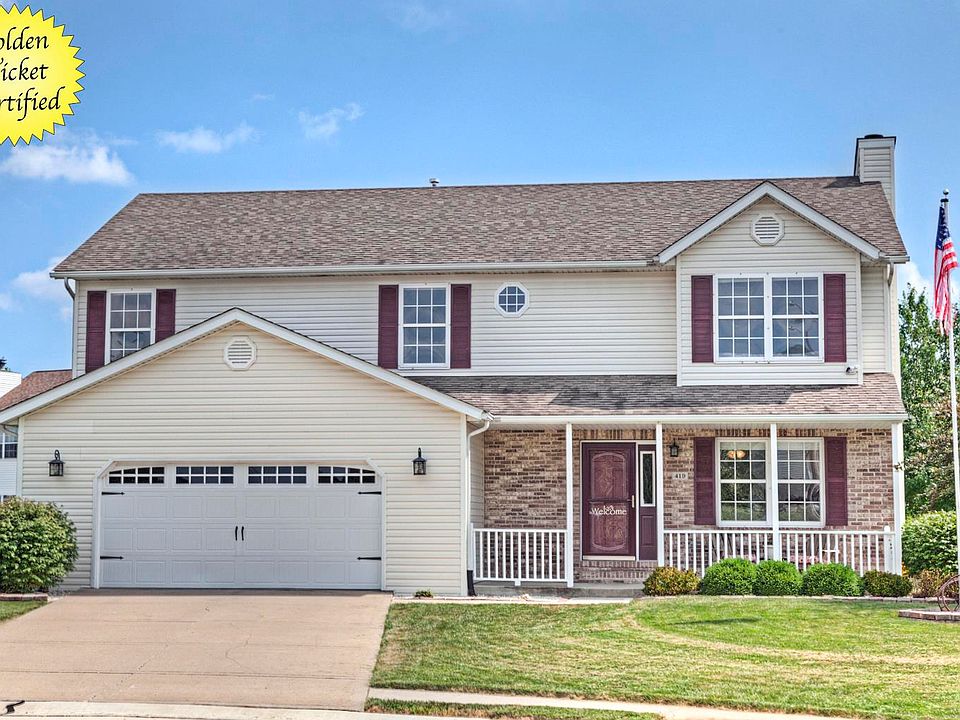 New carpet on the 1st and 2nd floor, and neutral paint colors throughout create a fresh palate to truly make this 2-story home with finished basement your own. Covered front porch to entry with glowing hardwood floors. Living room with corner fireplace with raised brick hearth. The setup of the dining room and kitchen are perfect cooking, and entertaining guests, or just making dinner for the family. Main floor laundry with built in cabinets. Vaulted ceilings in the 2nd story family room create an open and spacious feel. Master bedroom with walk-in closet, and in the master bath there is a jetted tub, dual sink vanity, and separate shower. Finished basement with large recreation room and there is also a storage room. The covered deck and paver block patio offer lots of space for barbeque's and relaxation. In the backyard there is also a playset in a huge rock bed. The location allows for quick access to Scott AFB, highway 64, shopping, restaurants, and O'Fallon parks.