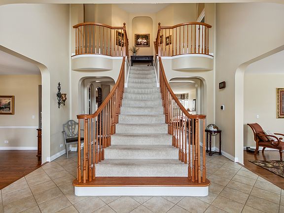 This stately residence is one of Kimball Hill Homes finest layouts, the "Belmont". The Foyer is graced by a center bridal staircase with Juliet balconies on either side of the 2nd floor landing. The home is also enhanced with a separate rear staircase. The elegant Living Room is a perfect place for those quiet moments or to enjoy the company of family and friends while you entertain. The Dining Room is gracious in size with gleaming hardwood floors and can accommodate large gatherings. A hallmark of this sought-after layout is the expansive Kitchen and Breakfast Room. The owners had brick accent walls custom designed to warm up the space and add a tuscan flair. Kitchen boasts an enormous amount of 42" cabinetry w/ crown molding, beautiful abundant granite counters and breakfast bar, task lighting, planning desk, all stainless steel appliances and warm stone backsplash. Entertaining is a joy at the huge island with the wine storage and beverage refrigerator and of course the large panty. The kitchen is sun-drenched and the large Breakfast Room has sliders to the free-form brick paver patio with private wooded views. A large, yet cozy Family Room is graced with hardwood floors and a beautiful fireplace w/ transom window above and is flanked by windows allowing the natural beauty in. The arched design allows an open view to Kitchen, yet separation for furniture placement and a large wall for the flatscreen. Surround sound speakers are included too. A private Office is located at the rear of home and a large first floor Laundry is located off the Kitchen by the garage with a side exterior access door to extended parking. A sumptuous Primary Bedroom suite is expansive with the cathedral ceiling and separate Sitting Room with backyard views. A luxury bath has separate dual vanities, a corner soaker tub w/ plantation shutters, separate tiled shower, water closet and 2 large walk-in closets complete with custom designed furniture quality organizers. The additional bedrooms are extremely very spacious, have vaulted ceilings, large closets and are outfitted with ceiling fans. The bathroom was well-executed with dual vanities and a tub with shower. The toilet is compartmented separately and has a 2nd shower as well. The exceptional finished lower level has wood laminate floors and the Recreation Room has a 96" screen and projector, pool table/ping pong table area and beautiful bar with sink, dishwasher, bar refrigerator and mirrored display shelving. The Exercise Room is an added bonus and another room could be used as a playroom or spare bedroom, as the full bath is located a few steps away. There is great storage as well. The premium lot w/ mature wooded trees as your backdrop provides privacy from the homes on acre plus lots behind the tree line. A custom paver patio with seat walls and landscaping lighting allows for great outdoor enjoyment! This subdivision lies in the Barrington #220 School District and is conveniently located to shopping, the metra, hospital, the Fox River activities and quick access to Rt. 14. The family friendly neighborhood has sidewalks and a park/playground and ball field. This is an extremely sought after subdivision and a beautiful brick front stately residence loved by the original owners!