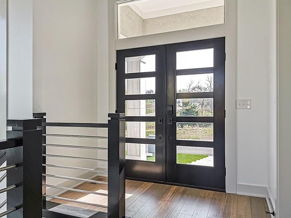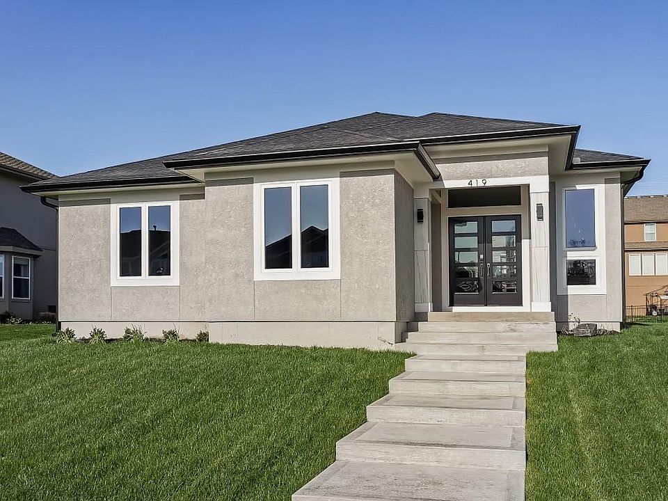 This beautiful modern ranch has a great open concept floor plan. Solid bamboo flooring flows throughout the entry, great room, kitchen, dining, mud room, and laundry. Stunning 11-foot ceilings carry through the main living area. The great room features a beautiful electric fireplace and a large row of windows allowing in plenty of natural light. The kitchen with center island includes granite countertops, granite composite sink, custom cabinets with soft close drawers and doors, upgraded hardware, black stainless appliances, and pantry. Dining area leads out onto a large entertaining patio. The Owner's suite with a trayed ceiling leads into a spa like bathroom with beautiful quartz countertops, double vanities, large format tile, separate toilet room, and spacious closet with floor length mirror. Second bedroom is a multipurpose room that can be used for a home office, guest room, craft room, or whatever you may need. Another bath is located adjacent to this room. The gorgeous modern staircase leads to an unfinished basement. Future plumbing is already stubbed in. As well as two possible bedrooms and entertaining area. A storm room is included for your safety in case of bad weather. Two car garage and sprinkler system are standard. This home is adjacent to trails and park. Prestige school district Olathe West. This is a great place to call home.