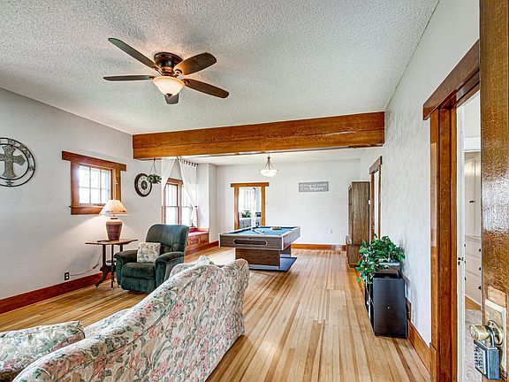 Return to quiet small town life with this fabulous Craftsman-Style Bungalow that's the perfect place to start your best life. Step into the inviting enclosed front porch that includes a delightful swing for peaceful summer evenings. Inside you'll discover gleaming hardwood floors in the spacious open living & dining. The kitchen has charming white cabinets to discover plus space for a breakfast table and a convenient laundry room by the back entrance for a great mudroom area. Two quiet bedrooms and a cool cast iron tub in the main floor bath complete the main floor. The finished basement has a large family room, third bedroom, ¾ bath and another room that could be converted to a legal bedroom with the addition of an egress window. A shady deck for summer meals and grilling, a large privacy fenced yard, very long driveway would allow for extra cars or an RV and detached garage are finishing touches to this special property.