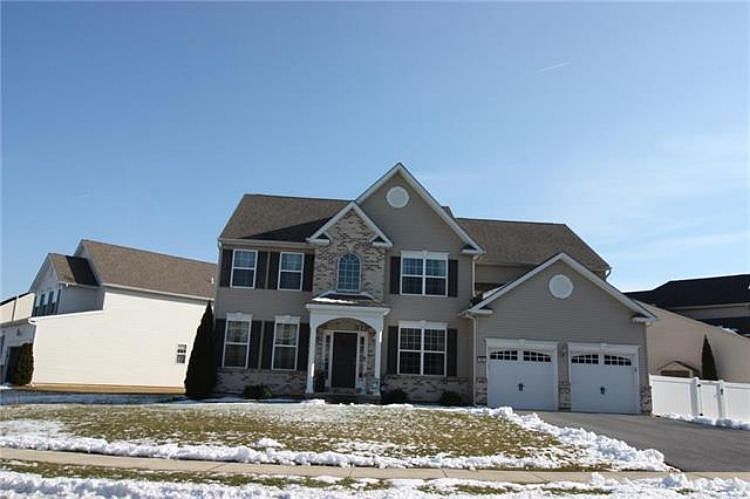 Spacious Colonial on large corner lot with a large side yard and a brick facade. Open the door to the inviting cathedral foyer and family room open floor plan. Over 3100 sq ft of living space, first floor office bedroom, large family room with fireplace, breakfast nook with sliders to stamped concrete patio, and fenced in yard. Spacious kitchen with pantry and center island. 2nd level offers 4 bedrooms and laundry room. Catwalk connecting bedrooms offers views of the entire 1st level of living space. Finished basement for even more family space as n added plus even more storage space. This home is equipped with solar panels to help offset costs and summer bills average $15-20 per month. Home shows like a model. Sellers are Highly Motivated!!