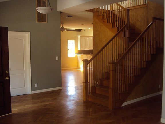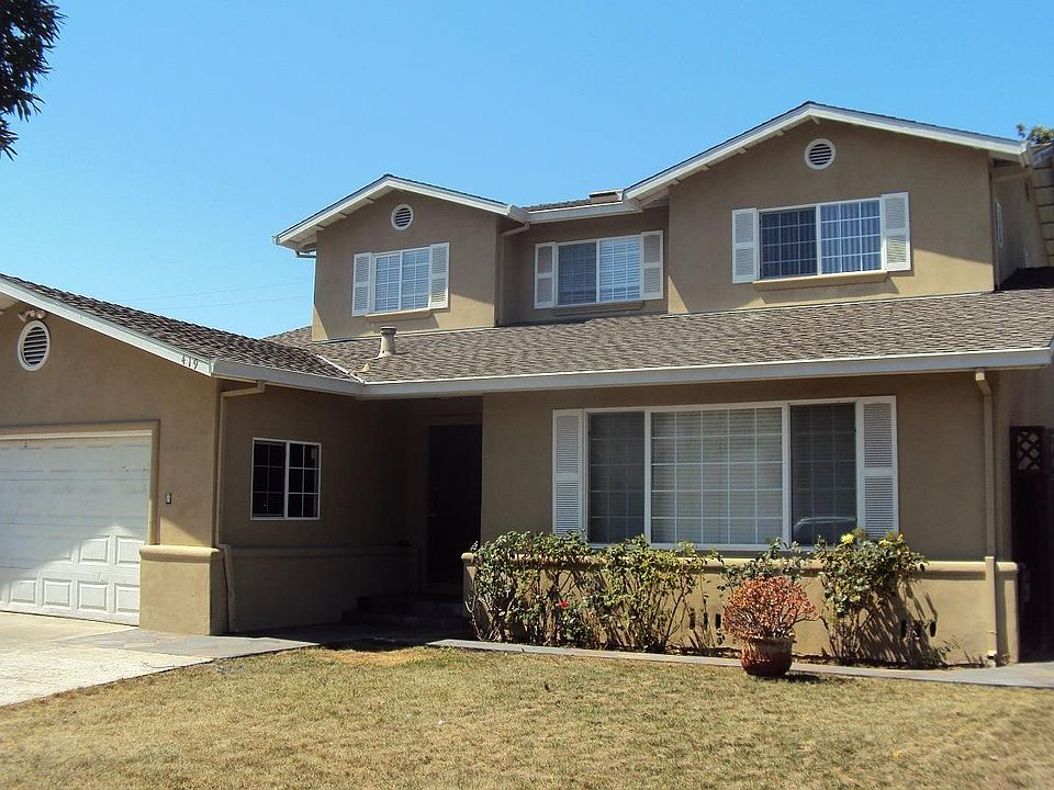 419 Rincon Ave, 5 Bedroom, 4 Bath, Living room with hardwood floors, Window Shades, Recessed Lights, Stair Case is hardwood, Large Eat-in Kitchen with Hardwood floors, Granite Counter, Double Oven, Large Pantry, Double Sink, Gas Range, Desk Trash Compactor (As-Is), and Dishwasher, two bedrooms downstairs with carpet, Main Bedroom Suite is located Downstairs with Carpet, Adjoining Bath with Tile Floor and Stall Shower, Downstairs Hall Full Bath with Shower/Tub Combo, Tile Floors and Counters, Upstairs Landing with Carpet, Fourth Bedroom with Carpet and Ceiling Fan, Hall Bath with Tile Floor, Tub/Shower Combo, Tile Counter, 2nd Main Bedroom Suite upstairs with Carpet, Ceiling fan, Two Walk In Closets, Adjoining Full Bath with Tile Floor, Double Sinks, Soaking Tub, Large Stall Shower, and Nursery/Office off Main Bedroom, Laundry Room with Tile Floor and Sink, Washer/Dryer Hookups, Double Pane Windows Throughout, Large Shed in Back Yard for Extra Storage, 2 Car Garage, Backyard.