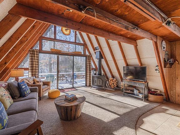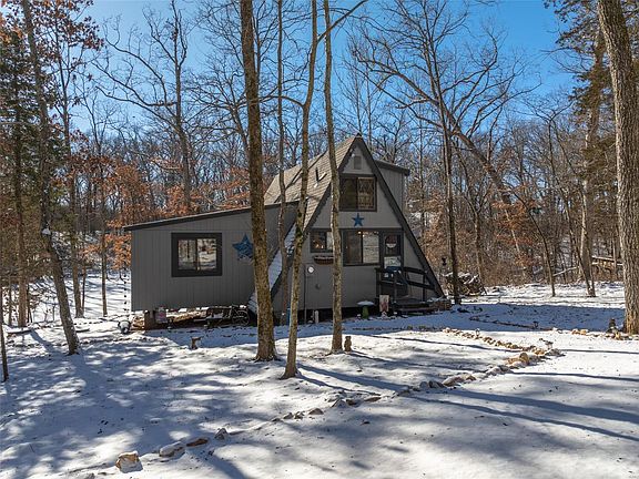 Your picturesque escape awaits at this ultra charming retreat! Nestled amongst nature, this enchanting chalet offers a serene oasis from the hustle and bustle of everyday life. The lakefront setting is complete with 2.5 acres of towering trees. S'mores away with not one, but two firepits! Stepping inside the warm and inviting interior is an updated kitchen and bathroom. The vaulted living room highlights a wood burning stove and large windows that bathe the space in natural light. The newly added main floor bedroom is the perfect sanctuary for a restful night's sleep. The cedar ceiling creates a cozy atmosphere while two large windows offer views of nature. Upstairs, the sleeping loft is complete with two full sized beds plus a futon. Star gaze, sip a cocktail, or dine with the family on the oversized lake view deck. Forever memories made here!!! (Chalet being sold furnished, minus a few exceptions. Golf cart and contents of shed are not included. Chalet cannot be rented.)