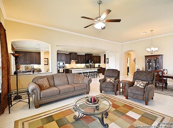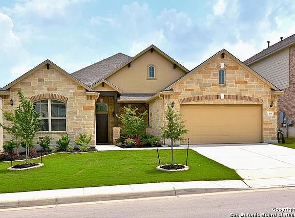 Enjoy Hill Country living with easy access to US 281 & TX 46. Located in Comal County less than a mile from shopping, schools and other services. The spacious one story home with no Stairs , has oversized bedrooms, open concept living area with soaring ceilings, a spa like master retreat with 3 vanities and huge mst closet. The dream kitchen features stainless appliances, gas cooktop, granite counters, huge island and storage galore. Oversized 3 car tandem garage, 34x10 covered patio. Shows like a model.