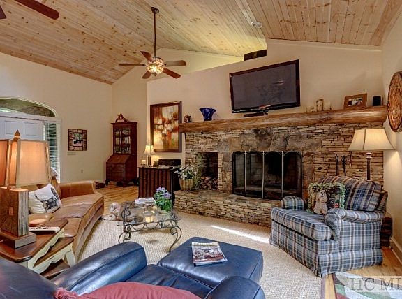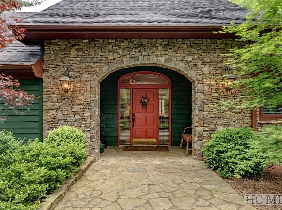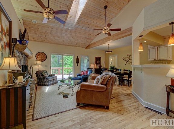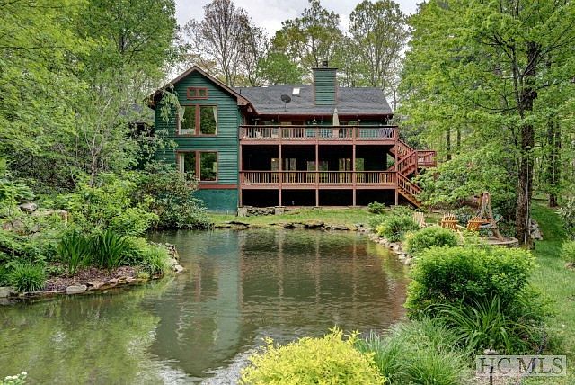 This lovely home is located half way between Highlands and Cashiers on nearly 2 private acres with a view of two large stream-fed ponds with a waterfall water feature. The home has an open plan with the foyer, living room, dining room and kitchen being open to each other, yet separate rooms. Features include a vaulted ceiling, hardwood and stone floors, a wood burning fireplace, skylights, 2 decks, updated appliances and a 2 car garage. The split bedroom plan has a master suite overlooking the view and opening to the deck on one side; with 2 bedrooms and a bath on the other side. The lower level has a large great room that can be used as a den, exercise or entertainment room; another room that can be an office or additional sleeping space a full bath and a wet bar. Relax by the fire pit in the outdoor living area right beside the pond and stream. Furnished with few exceptions. Community amenities include a tennis court, pond and picnic pavilion.