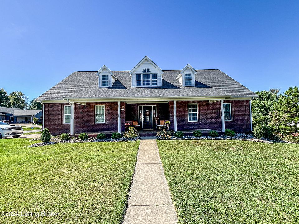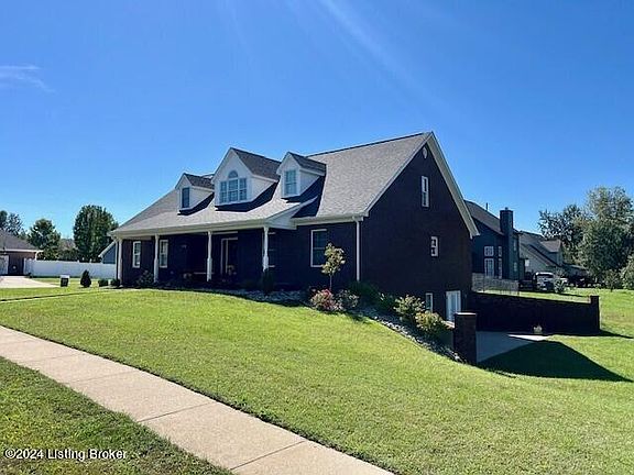 Nestled in the heart of Elizabethtown on a desirable corner lot in Willow Creek Estates, this stately brick Cape Cod is the epitome of custom craftsmanship and charm. Boasting 5 bedrooms, 3 bathrooms, and living space on 3 levels, this home offers ample spaces for both relaxation and entertainment. The curb appeal of the tasteful landscapes and inviting covered front porch with intricate aggregate and brickwork set the stage for the grand two-story foyer that welcomes you. An elegant staircase leads to the upper-level catwalk overlooking the great room and featuring 2 huge bedrooms, (one ensuite- a second primary suite) and four mammoth closets. The spacious great room has cathedral ceilings and a fireplace and seamlessly flows into the dining area, where a picturesque bay window frames views of the fenced backyard. The adjoining kitchen offers abundant solid wood cabinetry, ample space, and a pantry that is a chef's dream. The primary suite is a true retreat with two large walk-in closets and a spa-like bathroom that includes a shower and separate tub. This home offers hardwood and tile flooring throughout, recessed lighting, a wood burning fireplace, and other touches that add to its warmth and character. Downstairs, the walkout basement offers even more living space, bathed in natural light from the large windows and atrium door that opens to a sprawling patio. With two brick retaining walls offering privacy, the patio is perfect for outdoor gatherings or quiet moments of relaxation. This home seamlessly blends elegance, comfort, and thoughtful design, making it a must-see gem in a prime location.