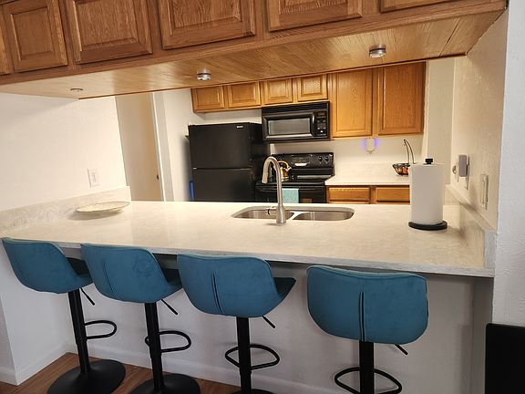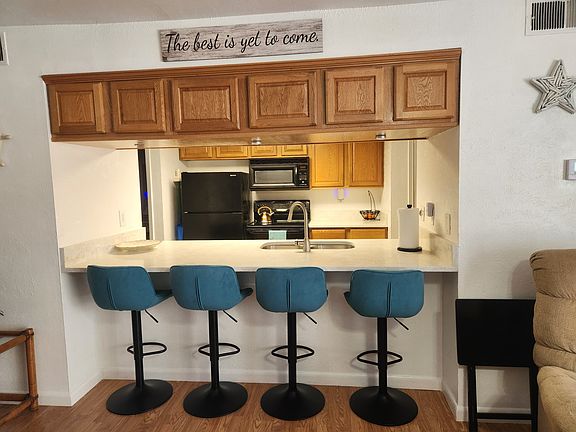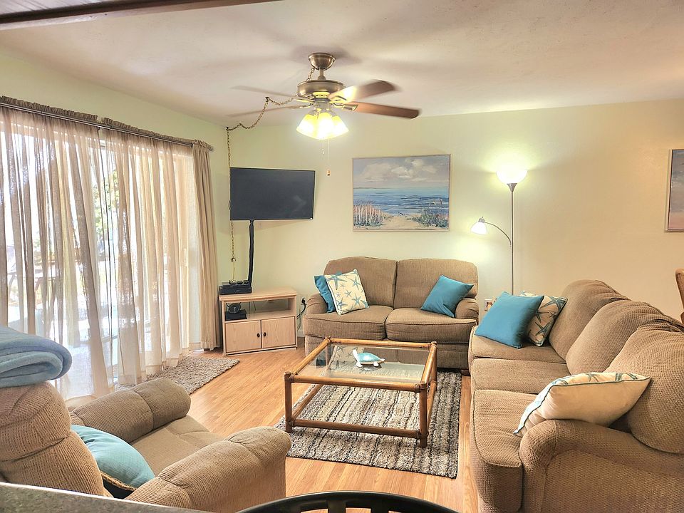 Immaculate, spacious furnished Ground level (no stairs!), quiet condo w/ 2 BR (queen size bed in one, 2 twin beds in the other, 2 full baths. Living/dinning area, full kitchen w dishwasher, microwave, coffee machine, washer/dryer in unit. Ceiling fans, heat, A/C, 3 flat screen smart TV's/DVD/Digital Cable over 200 channels, (1 smart TV not on cable for use with your Roku, Firestick and streaming accounts etc). free high speed Internet access (WiFi). Linens and dishes provided. Front porch with chairs and back tiled patio with table/4 chairs. Lots of parking spots available. Everything you need for a perfect vacation!