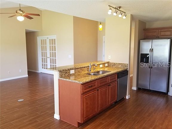 - Interior Features: Cathedral Ceiling(s), Ceiling Fans(s), High Ceiling(s), Split Bedroom, Walk-In Closet(s), Open Floorplan, Solid Surface Counters, Solid Wood Cabinets, Eating Space In Kitchen, Kitchen/Family Room Combo, Stone Counters, Thermostat