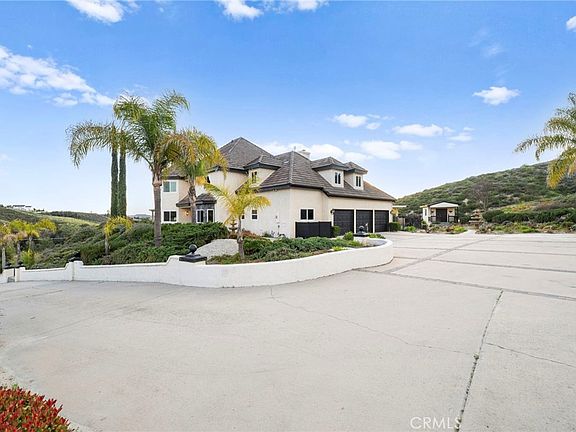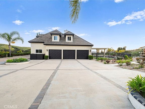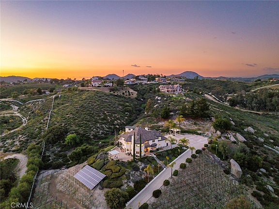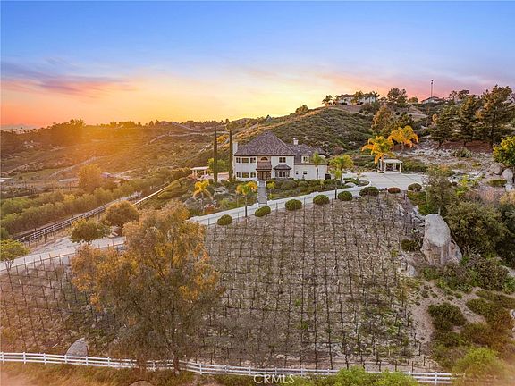 'Chateau Le Vert' is an impressive remodeled home in Wine Country, featuring everything you'd love to have in your next home. This French estate is perched at the top of a gated 4.48 acre lot, with mature planted Grenache that surrounds both sides of a stunning palm tree lined driveway that leads you up to your home. The top pad has room for over 15 vehicles, and the home features an oversized 3-car garage with additional storage space and built in cabinets. Over 50 fully-paid solar panels and all new double pane windows, this home is efficient and economical. The property is decorated with mature landscaping, a 100-plant rose garden, a fountain integrated into the hillside, with plenty of sitting areas showcasing a panoramic sunset view in the evening, and hot air balloons in the morning. A pebble-tech pool and spa with water features set the vibe in the backyard, also offering impressive views. Stepping inside the home, you're first greeted with soaring 25+ foot ceilings, a stunning crystal chandelier, and a curved wood banister staircase. Downstairs, you begin to feel the scale of the home, with a dedicated laundry room, a dedicated office (could be bedroom), a full bathroom, breakfast nook with amazing views, a formal living room, and a large family room with two new sliding doors leading to your backyard pool. The kitchen is new and remodeled, with 9ft ceilings, granite counters, custom cabinets, a quartz sink, new lighting, a built in refrigerator, and a walk in pantry. Stepping upstairs is even more impressive! Double doors lead you into your master suite, with more views, an electric fireplace. The bathroom suite is jaw dropping! Large format white marble floors and walls, a new vanity, and an oversized soaking tub under another crystal chandelier! The walk in shower is matching white marble on the floors walls and ceilings with custom glass... BEST OF ALL, there is a MASSIVE 150sqft+ closet and dressing room, also with custom shelves/cabinetry, and of course... VIEWS. Additionally upstairs is a guest bedroom with tons of closet space, a full bathroom, and another bedroom which could also serve as a bonus room for movies, billiards, and so much more. This home has so much more to offer and is a must-see. Don't wait on this one, it will not last long.