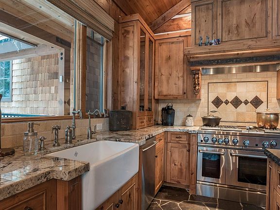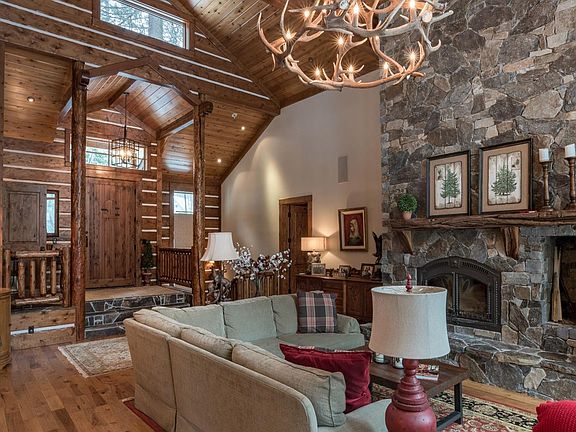Situated on a beautiful wooded lot overlooking the unobstructed forest views is this one-of-a-kind exquisite mountain home just waiting to be your next luxury getaway in the Sierras. Immediately upon entering, the Great Room boasts custom wood work, soaring ceilings with wood beams and two stories of windows looking out into the forest. The Living Area creates a cozy ambiance with a real rock fireplace, chinking of logs, grand Elk Antler chandelier, and rich Hickory radiant heated floors (throughout home). The dining room and kitchen are open to the living area which can accommodate grand gatherings while providing the ease of cooking with top of the line stainless steel appliances, granite counter tops, natural slate floors, as well as plenty of storage in the custom wood cabinetry. 4 guest bedrooms and the game room/media room are located on the lower level.This home rivals some of the most beautiful real estate one would expect to see in luxurious ski towns such as Vail or Aspen.