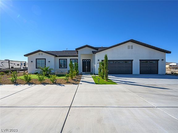 WOW! Stunning brand new one-story home sitting on almost an acre! The large backyard is an open canvas waiting for your creativity and personal touch such as toy garage, workshop, huge garden, orchard or all of these. The spacious open floor plan welcomes you at the front door with stunning finishes. Flooring is modern tile throughout common areas, while carpet fills the four bedrooms. The kitchen features quartz countertops, a walk-in pantry, an island and stainless steel appliances. Adjacent to the kitchen is the cozy living room complete with an electric led wall fireplace. The primary bathroom features double shower heads, a jacuzzi-style tub, double sinks and a custom walk-in closet. The entire home has a fresh feel bringing in an abundance of natural light. Enjoy no front, left and right-side neighbors and a three-car garage. Built in 2022. Pahrump is an 1h15m drive from the heart of Las Vegas. Come fall in love and make an offer!