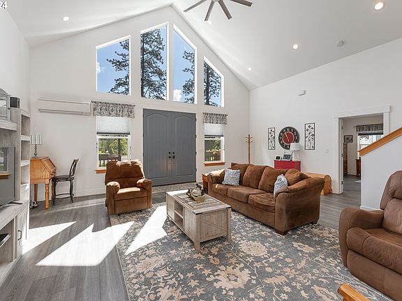 Absolutely amazing custom home built in 2021 on 0.73 acre will impress you with high ceiling , open floor plan, spaciousness and natural light flowing from everywhere! This is 3 bed/2 bath/3car garage home has a large loft on 2nd floor and extra unit with full bathroom, if you need a guest space, gym, craft room on the second level of 2nd detached garage. A beautiful spacious living room with huge cathedral windows overlooking the surrounding evergreen mountains, a view of the moon and many birds on the tall trees in front of the house, allows you to enjoy the warmth and coziness of the pellet fireplace. The elegant, large, light-filled kitchen features a huge island, rich quartz countertops, plenty of convenient silent cabinets, a double oven, an extra-large pantry, newer stainless-steel appliances and numerous lights on multiple levels, offering the ultimate modern convenience.Spacious dining room looks on the back yard with sprawling beautiful green fields (table included in sale). Spacious split master suite has walk-in closet and master bath with granite top, double vanities, walk-in shower and additional storage. Each room has its own wall-mounted heater and A/C for convenience and energy efficient. Beautiful front covered porch and covered back deck with added patio to enjoy the peace, privacy and to relax the spaciousness and beauty of nature. Deep 2 cars attached garage. 2nd detached one car garage with shop, well organized chicken coop on ground level and living unit on top level. Tool shed, RV parking, many fruits trees . This property located in minutes from town, schools, freeway, river, casino and has everything to relax , enjoy life among the beauty of forested mountains, fields and nearby running river.