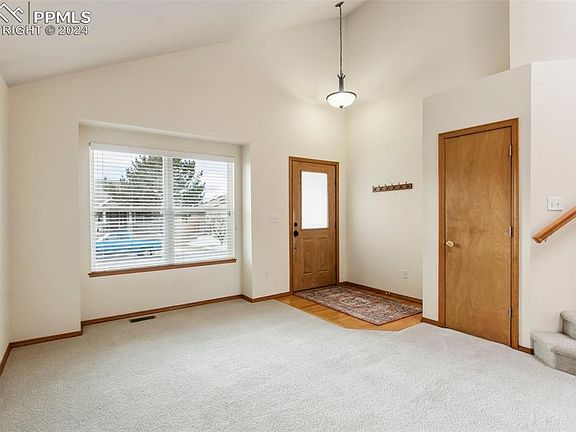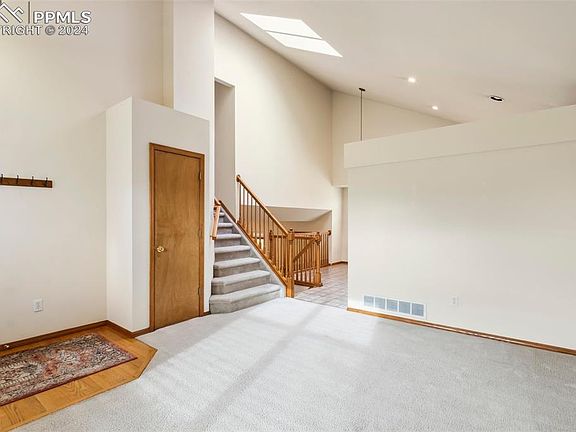 Welcome to an exceptionally maintained D-20 Home! This property is conveniently situated near the hospital, YMCA, and various shopping options. Inside, you will find soaring ceilings and skylights that bring in ample natural light. The large kitchen features upgraded fixtures and stainless appliances a spacious dining area, perfect for entertaining guests. The family room includes a cozy gas fireplace and a walk-out access to the fenced yard, complete with a concrete patio and a sprinkler system. The master bedroom offers stunning views of Pikes Peak and the front range, along with an attached bathroom featuring a double vanity, soaking tub and new flooring. Additionally, the finished lower level is currently designed as a 4th bedroom but can easily serve as a family room or guest suite (no closet) with its private half bath. New roof and water heater in 2023.