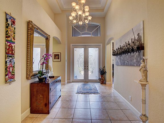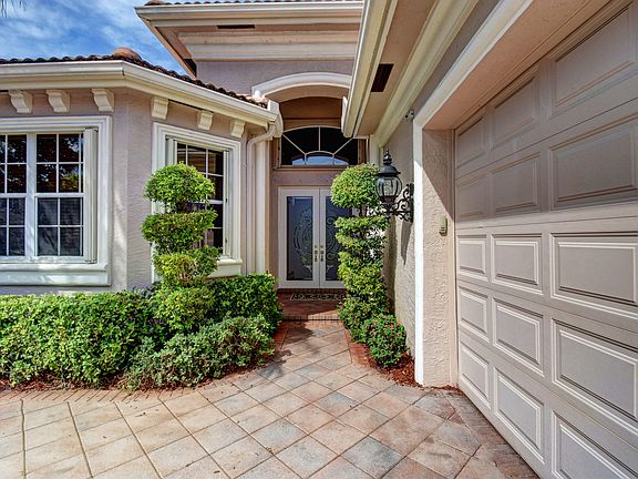 Enter through etched glass double doors into this charming one-story home of 4 bedrooms and 3 baths located on a private lot -- light & open featuring volume ceilings with crown moldings, neutral tile & wood floors; an open kitchen with 42'' light oak cabinetry with roll-outs, corian counters & a lovely breakfast nook; Family Room entertainment center; marble tiles & shower in Master bath; custom sun shades & wood blinds on the windows; extra high-hat lighting; custom closet design; newer air conditioning - 3 years old; accordion hurricane shutters and an inviting spacious patio offering a covered lanai & an open area with a heated pool.