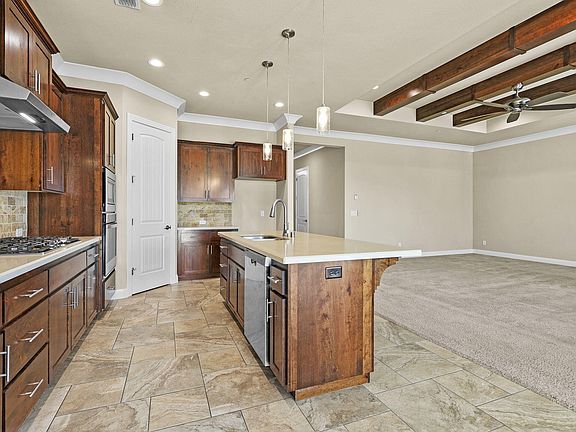 Located in the highly desirable Salt Creek Heights Subdivision, this stunning 4-bedroom, 3-bathroom home features an array of high-end finishes and thoughtful upgrades throughout. The exterior is beautifully adorned with stone detailing, offering exceptional curb appeal. Inside, you'll find luxurious tile showers and an elegant tile surround above the bathtub, creating a spa-like experience in the bathrooms. The chef's kitchen is a dream, showcasing stylish Quartz countertops, a large kitchen island ideal for entertaining, and top-of-the-line appliances. Custom cabinetry and crown molding elevate the interior's sophistication, while upgraded light fixtures, ceiling fans, and plumbing fixtures add modern convenience and style. A durable tile roof completes the home, offering both beauty and long-lasting protection. Front and rear landscaping, complemented by additional concrete walkways and outdoor spaces, enhance the home's curb appeal. Inside, a beam ceiling adds charm and character to the open living areas, making the home feel spacious and inviting. With meticulous attention to detail and a design focused on luxury and comfort, this property in Salt Creek Heights Subdivision offers the perfect blend of modern living and timeless style.