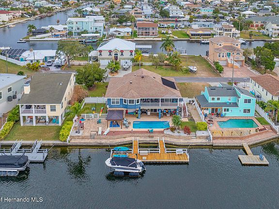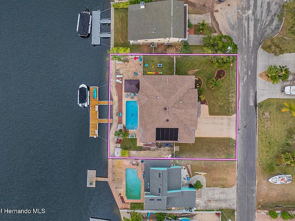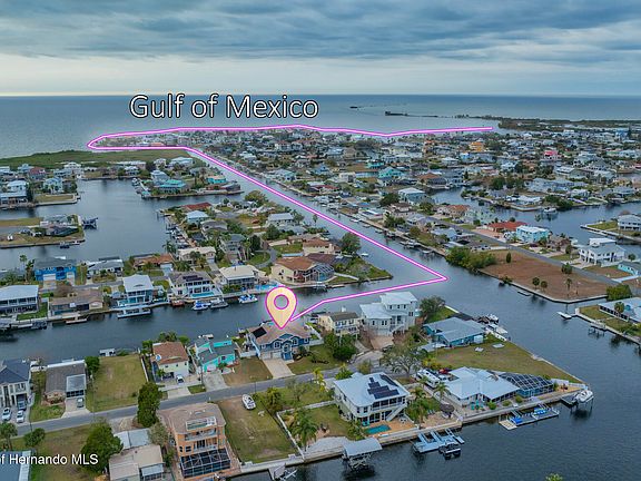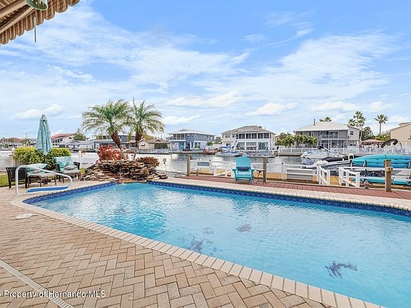 DIRECT GULF ACCESS, ELEVATOR, HEATED SALTWATER POOL, DOUBLE LOT, REAR WESTERLY FACING LOT, 100' OF SEAWALL, DEEP WATER WITH LARGE DOCK, NEW ROOF INSTALLED BEFORE CLOSING, LOTS OF ROOM FOR ALL YOUR TOYS, NO HOA, NO SHORT TERM RENTAL RESTRICTIONS. What more could you ask for??? This dream home was constructed in 2004. The spacious second level is 2321 SF and has 3-bedroom, 2-bathroom, an office (potential 4th bedroom), formal dining room, newly remodeled kitchen, and a large living room with pocket sliders leading to a screened-in rear porch (westerly-facing backyard) - perfect for enjoying the cool breezes and incredible sunsets. The oversized primary suite offers access to the screened in porch, dual walk-in closets and a luxurious bath with a huge walk-in shower. The first level features a 4 car tandem garage, sauna, and 1000 additional SF of air conditioned area for entertaining. The pavered backyard has multiple areas of beautiful outdoor living space. Entertain in style with an outdoor kitchen, fireplace, and a stunning pool with a waterfall feature. The large floating dock and drive-up inflatable boat lift make this home a boater's dream, while the fully fenced double lot provides ample storage for all your toys. Hernando Beach is a fast-growing waterfront community, offering endless outdoor activities such as boating, kayaking, paddleboarding, and fishing. Just minutes from the world-famous Weeki Wachee Springs, you'll enjoy easy access to shopping, dining, schools, hospitals, and more! The nearby Suncoast Parkway ensures quick commutes to Tampa, Brooksville, and beyond. Experience the ultimate Florida lifestyle - your waterfront paradise awaits!