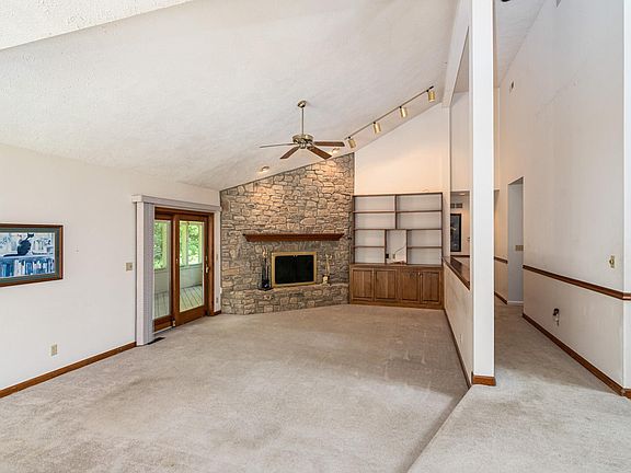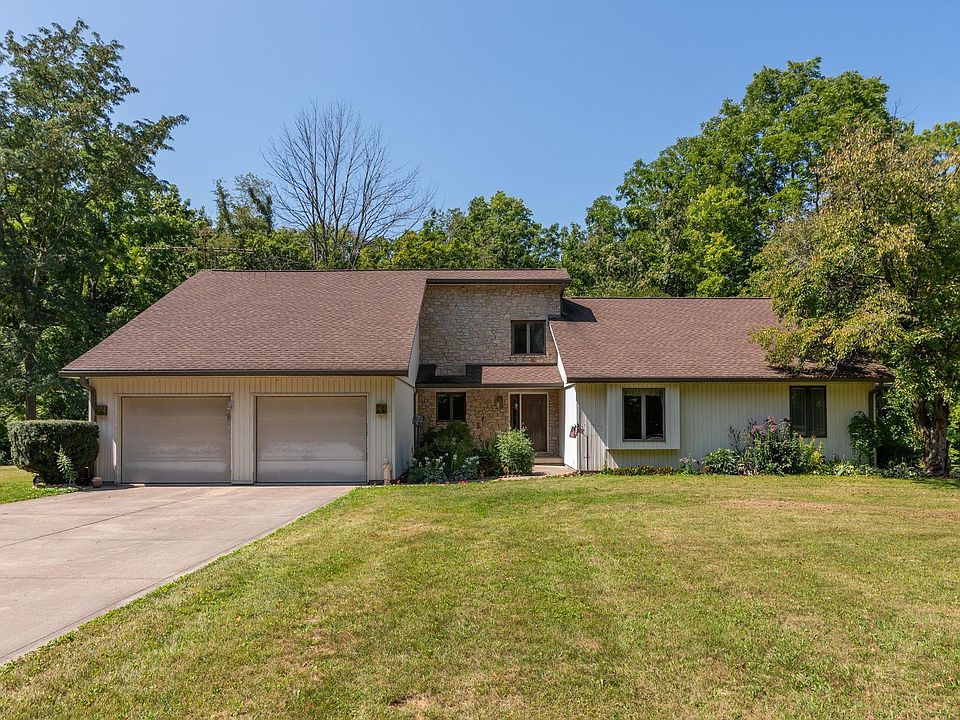 Welcome to your new home! One owner home built by Dan Fawcett nestled on 7.9 acres of scenic land with private setting. This home allows you to embrace nature, allowing you to explore and appreciate the beauty of this setting. You will fall in love when entering the large foyer looking into the great room with vaulted ceiling, floor to ceiling stone wood burning fireplace (with gas starter) and built in book cases. Large eat in kitchen with breakfast area featuring new hardwood flooring, formal dining area. 3 bedrooms, primary suite with shower and jetted tub, double vanity and large walk-in closet. This home offers so much storage, main floor utility room with 1/2 bath. Finished walk out basement with full stone fireplace, 1/2 bath ready to add shower. Built in cabinetry for entertaining and so much more. Relax and unwind on the screened porch off the great room or from the master bedroom. Open deck for grilling and entertaining. 36 X 24 pole barn and 12 X 31 carport for additional storage as well as a large attached garage.