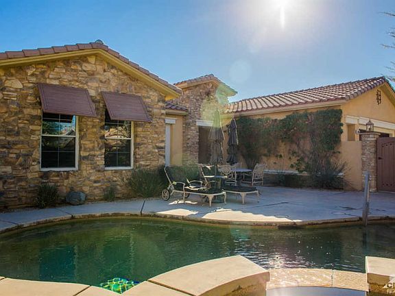 Just reduced $25,000!! Your Oasis awaits at this private resort style home in Venezia. Upon entering, you will be immediately enticed by a private front yard, heated west facing pebble tech pool and spa! Gorgeous views of the sky and mountains are perfect backdrop to watch the fireworks on the fourth of July. Pride of ownership! This three bedroom, two and a half bath paradise has been impeccably maintained by the owners. Travertine floors in the spacious great room, fresh paint throughout and beautiful laminate flooring in the bedrooms. Chefs rejoice in this large, gourmet kitchen with granite countertops, large center island, cooking grotto and breakfast bar make it perfect for gatherings. The home boasts surround sound throughout. French doors invite the outdoors! Large finished garage. Low maintenance landscaping in front and back yard. Two newer HVAC units with allergen filters, outdoor misters, plantation shutters, and so much more. This desert jewel won't last long!